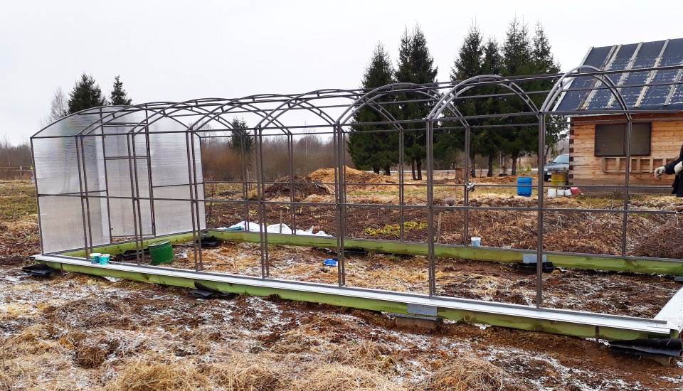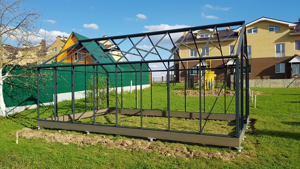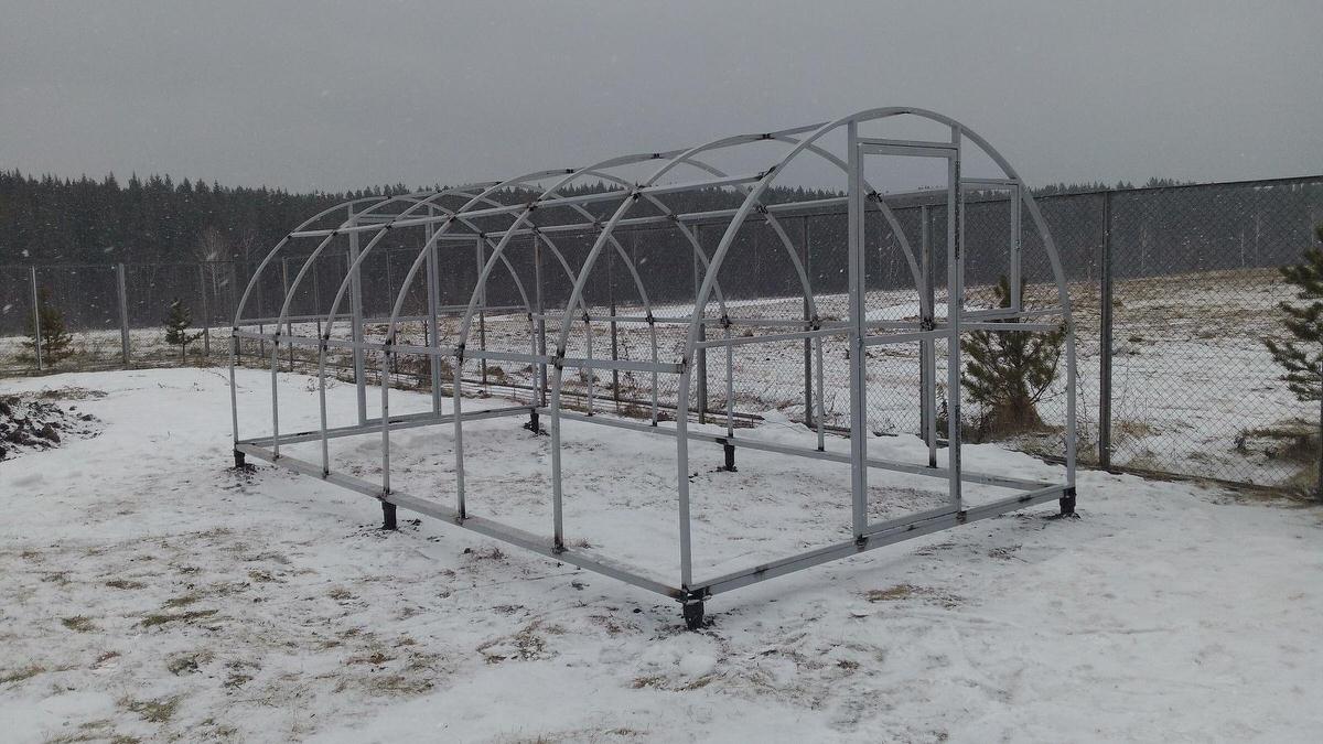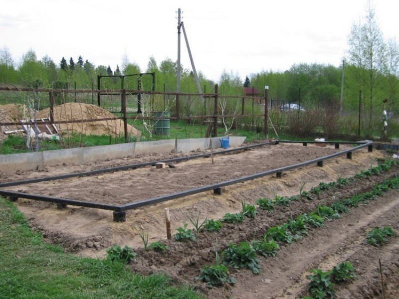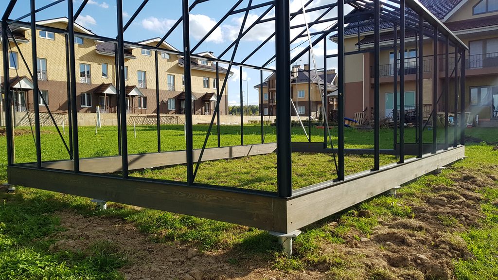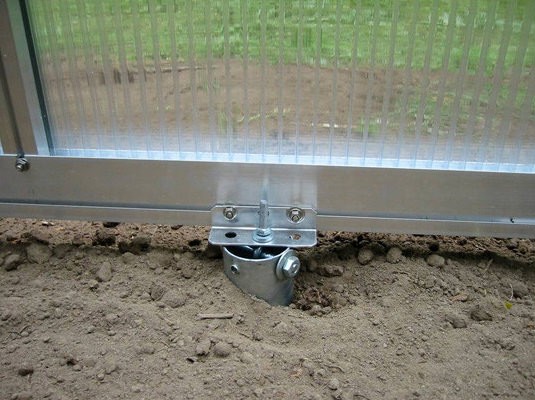 Свайный фундамент подходит для возведения теплицы на неровном грунте. Поверхность свайного поля выравнивается за счёт использования винтов разной длины.
